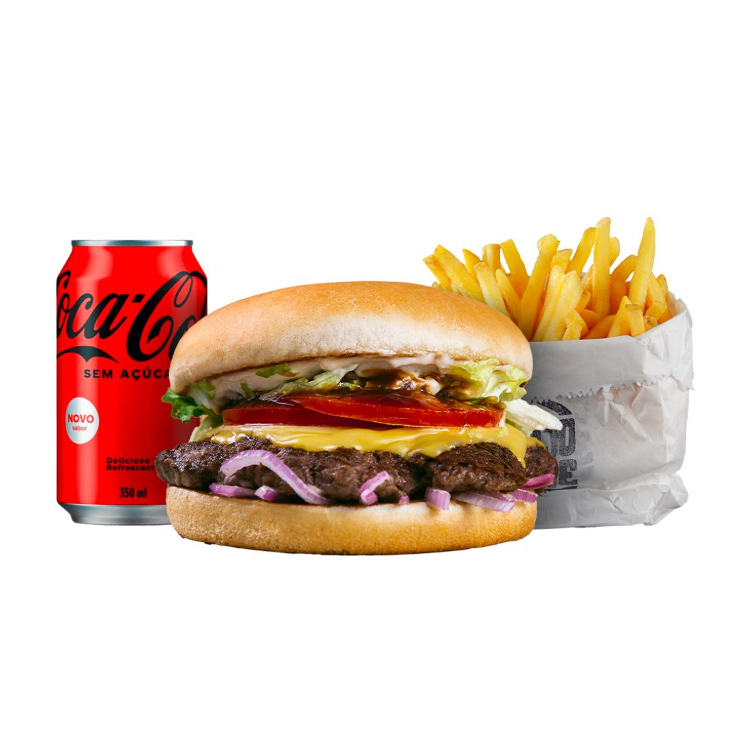 Você escolhe 1 Burger Tradicional (ou Burger Especial por R$10 a mais), acompanha uma porção de 100g de batatas fritas e 1 Coca-Cola lata.
