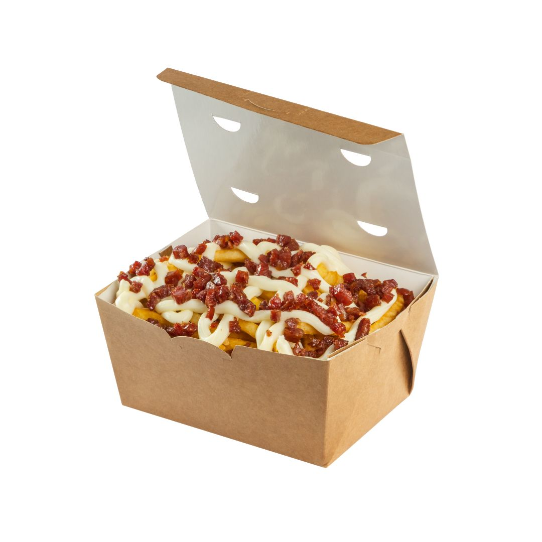 200g de batatas fritas Surecrisp Mccain, fininhas e crocantes, bacon em cubos e requeijão cremoso Catupiry Original.